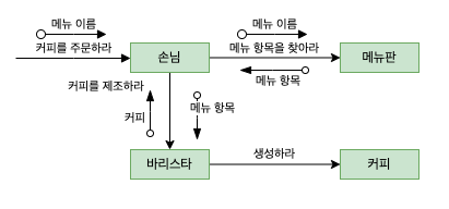 - 예: 손님은 메뉴판에서 주문할 커피를 고르기 때문에 메뉴판 객체를 알아야 한다. 즉, 관계를 맺는다.