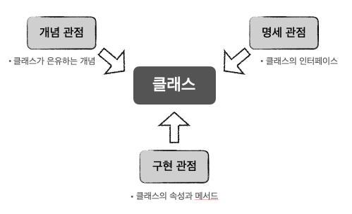 - 개념 관점, 명세 관점, 구현 관점은 순서가 아니라 한 번에 고려되어야 한다.