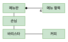 - 손님, 바리스타, 메뉴판, 메뉴 항목, 아메리카노, 카푸치노, 에스프레소, 카라멜 마키아또 객체로 구성된다.